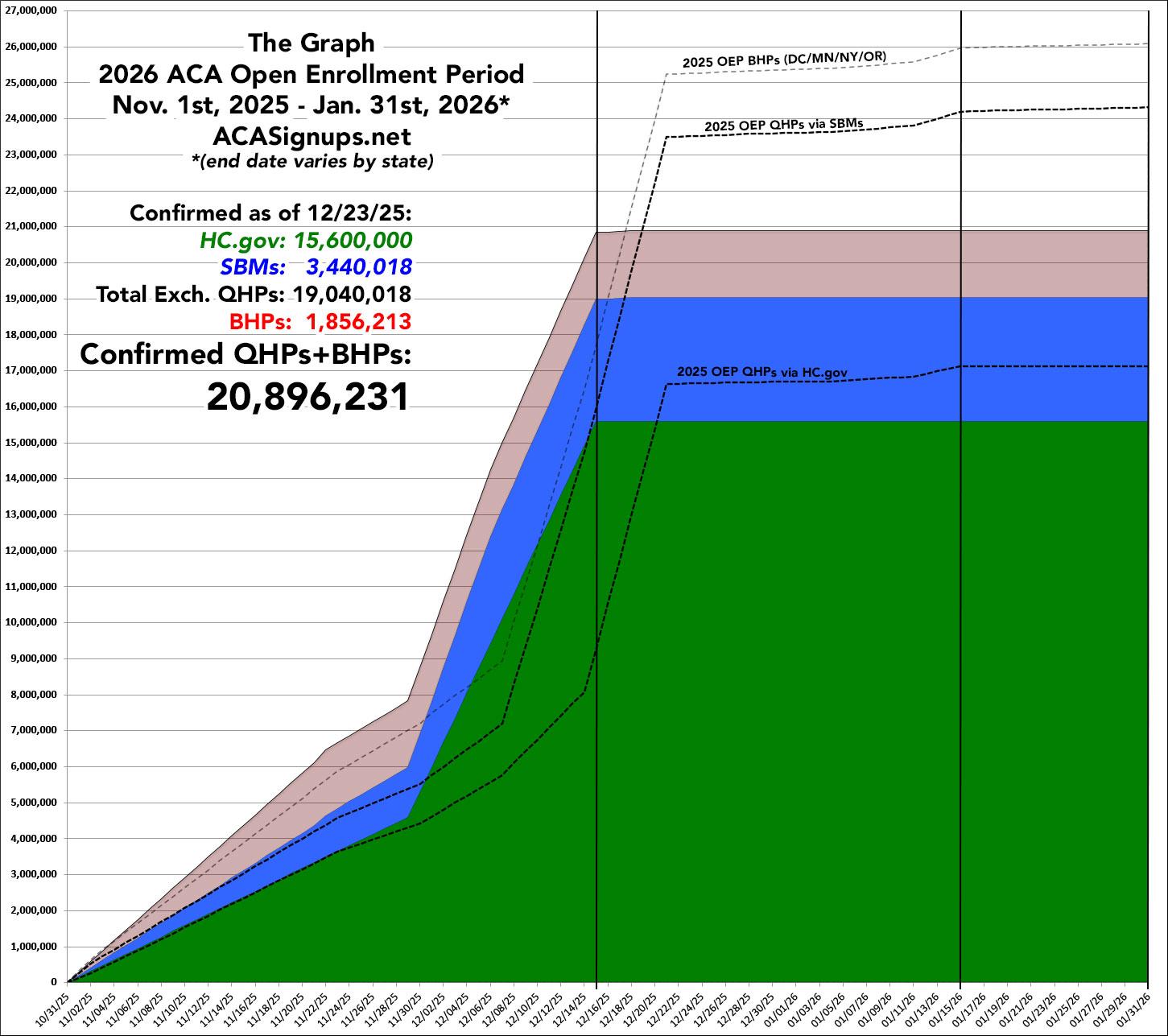 - Second: The actual total number of federal exchange enrollees at the same point a year ago was actually over 16.6 million...at least that's the number reported as of December 18th, 2024. Dr. Oz didn't provide the actual thru dates for either last year or this year, so I have to assume that the actual drop-off is around 1.0 million or so.