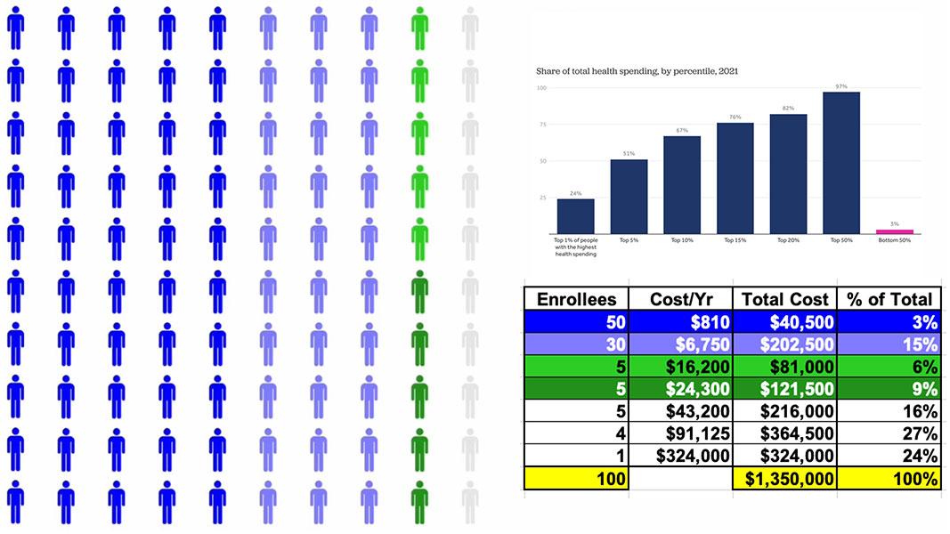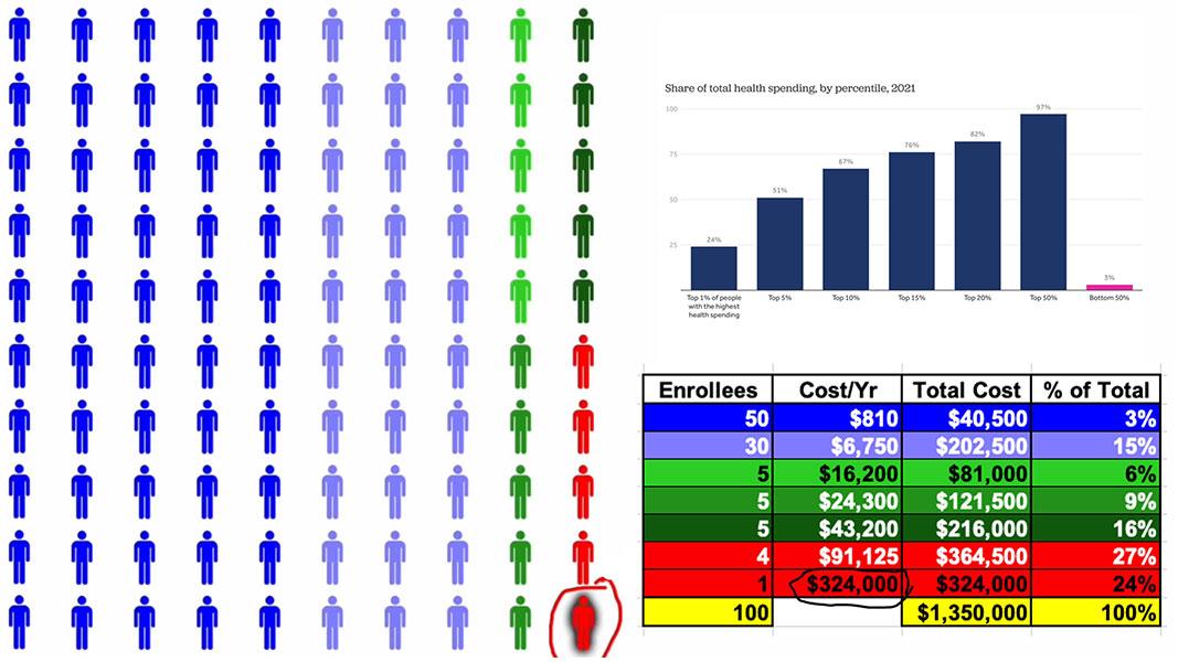 Using the KFF graph, this is how that $1.35 million breaks out across all 100 people. Half only need around $800/year in medical spending; another 30 would run $6,700 apiece, and so on.