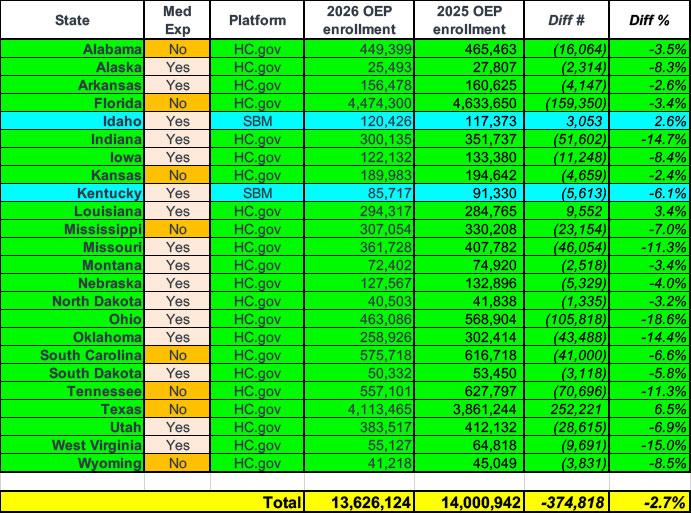 Now that the 2026 ACA Open Enrollment Period is nearly finished and the Centers for Medicare & Medicaid Services (CMS) has published a semi-final breakout of actual exchange enrollment by state, I decided to break those numbers out in several different ways. Unfortunately, it will be awhile before I'm able to do so by Congressional District, but I can at least do so at the state level.