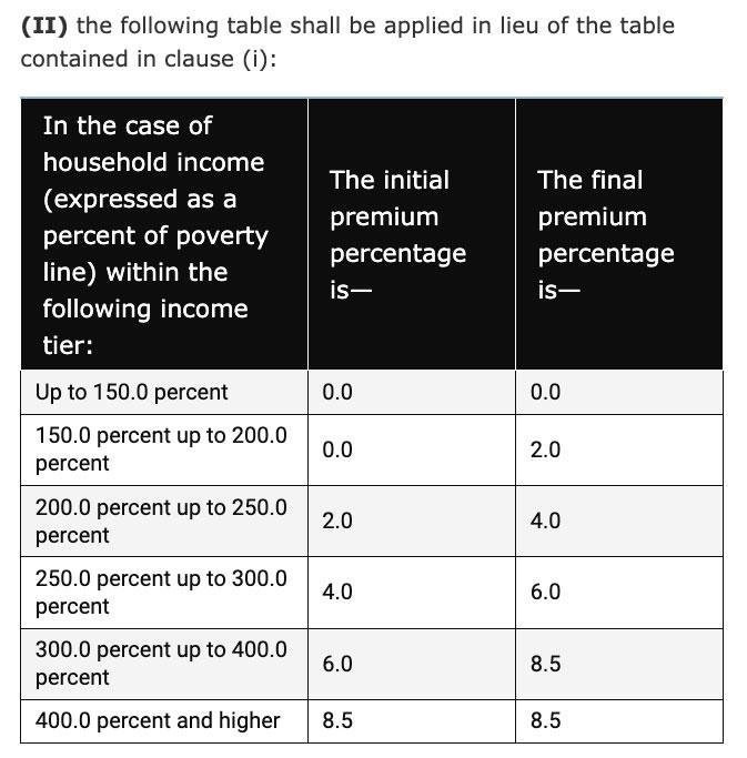 Maybe I'm misunderstanding something, but it sure as hell looks to me like that section of the bill would significantly weaken the tax credits for enrollees who earn between 250 - 400% FPL, by changing "4 - 6%" and "6 - 8.5%" of income to "8.5% of income."