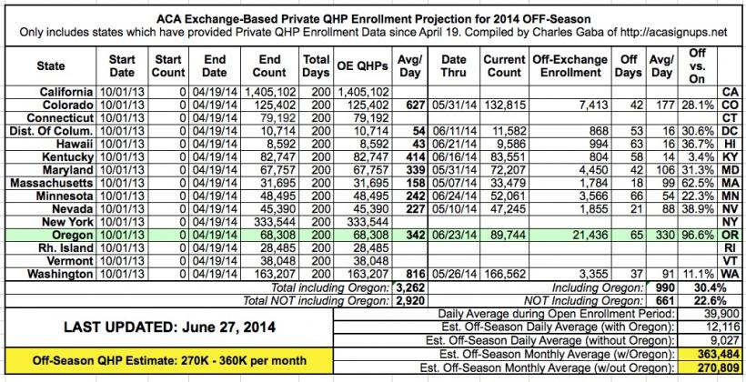 Compared with the previous report, MD had a 4,300 QHP increase from 5/10 - 5/31, and an increase of 4,450 since the end of the open enrollment period. This means that they're averaging around 106 per day, or 31% of their average rate during open enrollment...which has had a significant impact on the Off-Season Projection Chart that I started posting yesterday (as you can see, MD had been only running 2% of the OE rate until now).