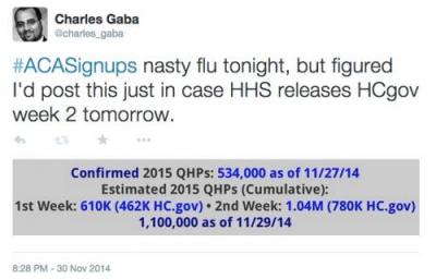 Then, on Wednesday, I'm going to assume that HHS will announce roughly 465,000 additional QHP selections in the 3rd week, for a total of around 1.23 million QHPs via HC.gov thorugh Friday, December 5th.