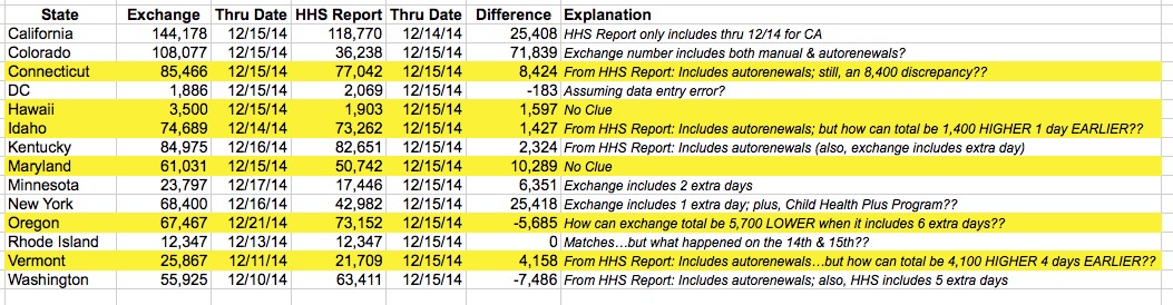 It got to be so strange that I actually whipped up a little spreadsheet for all of the state-based exchanges (minus Massachusetts, which is a special case anyway; plus Oregon, which is running off of HC.gov this year but has a large discrepancy from the official State of Oregon Website which is reporting enrollments this year as well). The yellow lines are the states I'm most concerned about (the others all have either obvious explanations or are minor enough not to worry about). Afterwards I'll run through the problems with each one.
