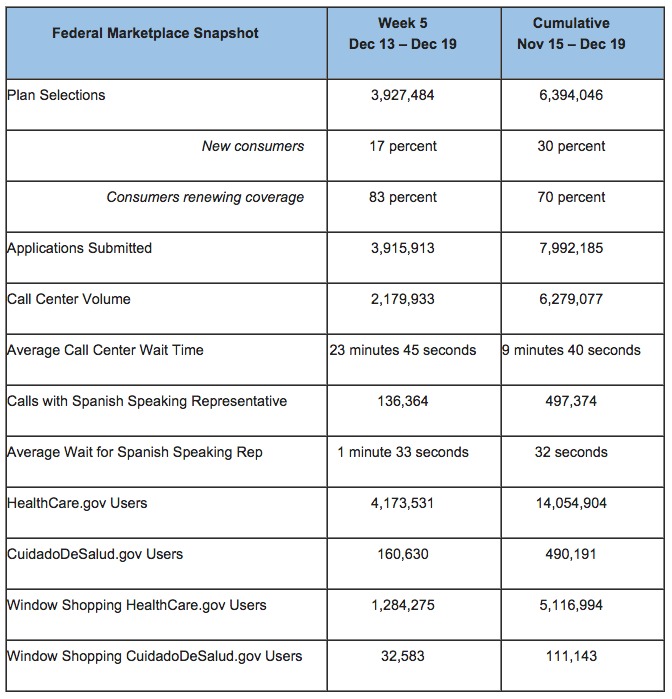 November 15th through December 19th (actually 5 full calendar weeks, which is what I'm guessing it'll include and which would be the most useful, since autorenewals for most states would be included). If so, HHS has already given the total as roughly 6.39M via HC.gov, and I'm estimating roughly 8.52M total (remember, my 8.65M estimate includes 4 extra days, through 12/23).