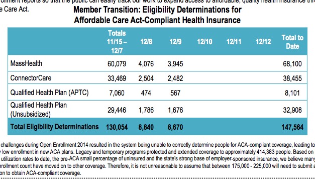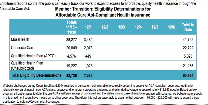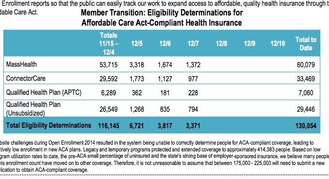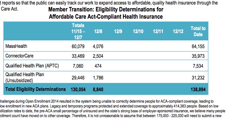 First, we have today's daily MA Health Connector Dashboard report, which states that there have been 148,453 QHP determinations thorugh yesterday (12/29). Assuming 50% of these have selected plans, that's around 74,200 QHP selections to date. In addition, the 134,803 Medicaid (MassHealth) enrollments are already locked in.