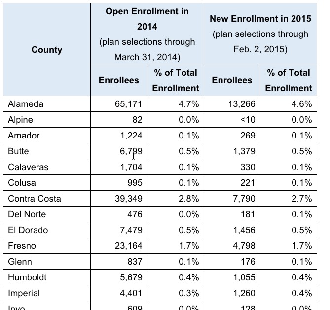 As of January 26th, California's 2015 QHP selection total was at least 1.217 million people. I say "at least" because the actual renewal number is a bit fuzzy (it's either 944K or 947K depending on whether you go by the CoveredCA or HHS/ASPE report). Anyway, today they issued a press release which at least updates the new enrollee number...if you do the math: