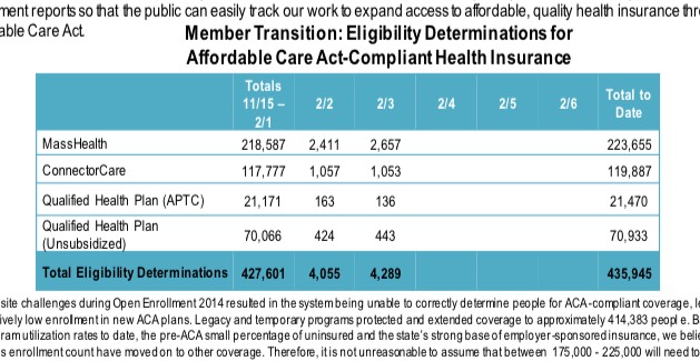 It's important to stress that this is not the final enrollment report for Massachusetts; it's the final daily report, which only includes the number of people determined eligible to purchase a private policy (Medicaid enrollees, however, are instant-activation; the number listed here is the number actually enrolled as of that day).