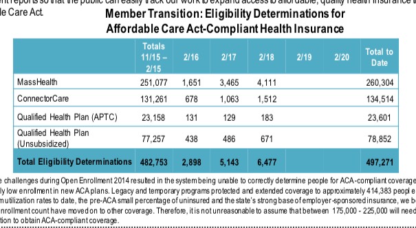 On Friday, the MA Health Connector confirmed 134,000 QHP selections out of 237,000 people determined eligible for QHPs as of 2/18. Since then they've added another 6,614 QHP determinations.