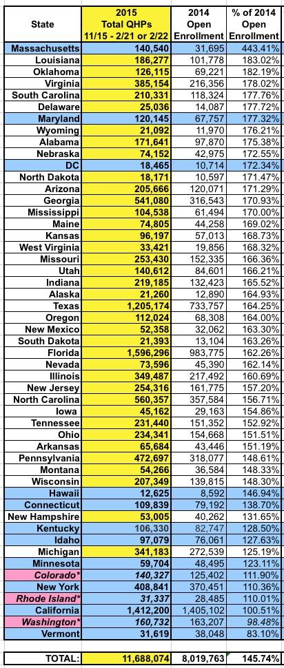 HAWAII: I was assured 8 ways from Sunday that Hawaii's23,000 enrollee figure was specifically for 2015 enrollment. This made no sense to me given their tiny enrollment last year, but I was assured of it. Well, apparently my original instincts were correct, because they're showing up with only 12,625 in the end.