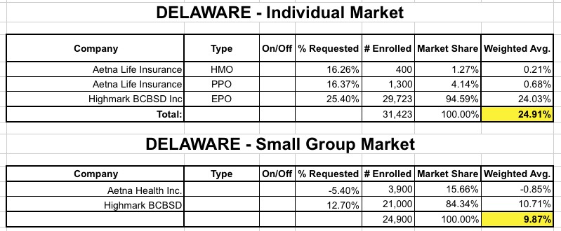 Delaware's 2016 rate hike analysis is about as simple and straightforward as it gets: Two companies (Aetna and Highmark BCBS) for both the individual and small group market, both on- and off-exchange, period...and their website includes the actual affected enrollee tallies for each, giving weighted totals: