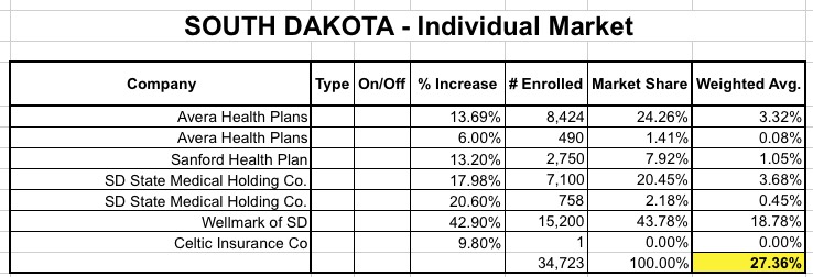 A few weeks ago, I crunched the (minimal) enrollment/rate numbers for South Dakota and came up with a fairly ugly weighted average rate hike of 27.4% (ouch). Being such a small state & population, there are only 5 insurance companies total offering individual policies either or off the exchange: Avera, Sanford, Welmark, Celtic and SD State Medical Holding, otherwise known as "DAKOTACARE" for some reason (and no, I refuse to capitalize the whole thing in the headline).