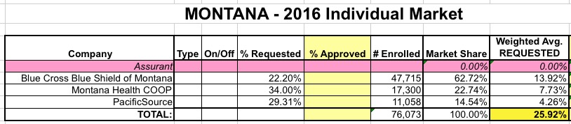 Fortunately (well, unfortunately, actually), all 3 of these are listed on Healthcare.Gov's "Rate Review" website, making it fairly easy to generate the weighted average. Sadly, it's grim news in Big Sky country next year: