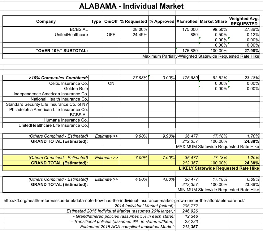 As with many other states, I'm working with limited enrollment and rate change data here, so plenty of caveats abound. However, Alabama's 2014 individual market was only around 206,000 people, and the ACA-compliant market should be roughly the same this year. I can account for 176,000 of that, so the remaining 30K or so are unknown other than being split among a half-dozen companies which requested rate changes of below 10% increases.