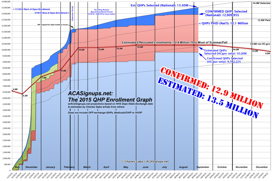 For months now, I've been operating on the assumption that the total number of currently effectuated private ACA exchange policies has been roughly 10.3 - 10.4 million, give or take. This was based on a combination of last year's enrollment pattern, the 214,000 additional people who selected QHPs during the #ACATaxTime special enrollment period, as well as assorted state-level enrollment updates out of California, Maryland and a few other state-based marketplaces.