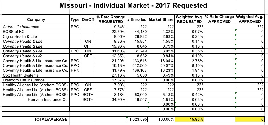 OK, there's something very odd going on with Missouri's 2017 rate filings for the individual market. According to the Kaiser Family Foundation, Missouri's entire individual market was around 344,000 people in 2014. While it's likely increased by around 25% since then, that would still only bring it up to around 430,000 people including both grandfathered and transitional enrollees, which sounds about right to me (290,000 enrolled via the ACA exchange, which would leave around 140,000 off-exchange).