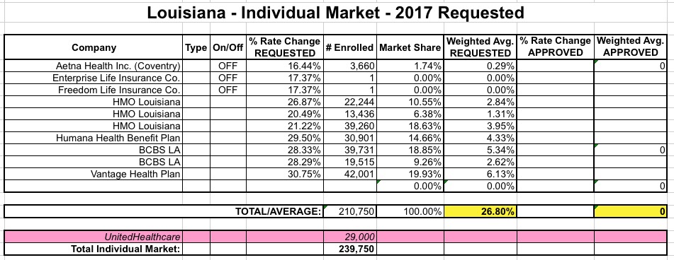 With this in mind, here's how things stack up in Louisiana for the ACA-compliant individual risk pool rate hike requests: