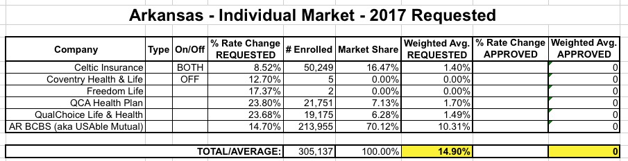 So just last Friday I posted the weighted average requested rate hikes for the Arkansas individual market; it came in at 14.9% overall, which is actually one of the lower statewide averages this year. As a reminder, here's what how the breakout looks: