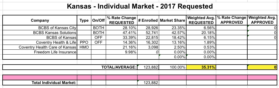 The good news about Kansas is that 5 of the 6 carriers which have submitted 2017 individual market rate filings included their current enrollment totals in a clear, easy to see format...and the 6th one is (once again) "Freedom Life" which, judging by the dozen other states they've popped up in, almost certainly has only 1 or 2 enrollees (or none at all) anyway.