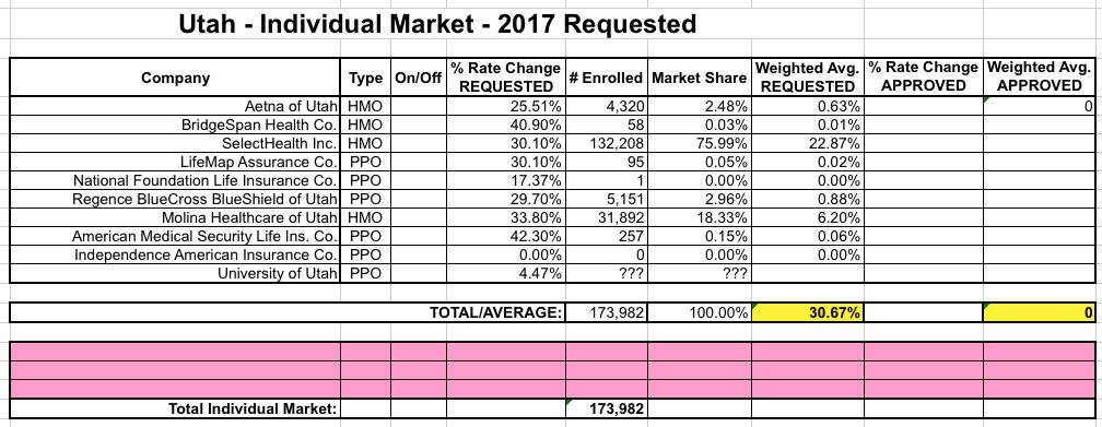 UPDATE 6/22/16: I've been informed that there was a coding glitch with Utah's website which prevented several carrier rate filings from being listed. I've gone back and plugged in the additional carriers, which account for about 32,000 more Utah residents...but which only moves the weighted average slightly, since Molina's request is fairly close to the 30% average I already had estimated.