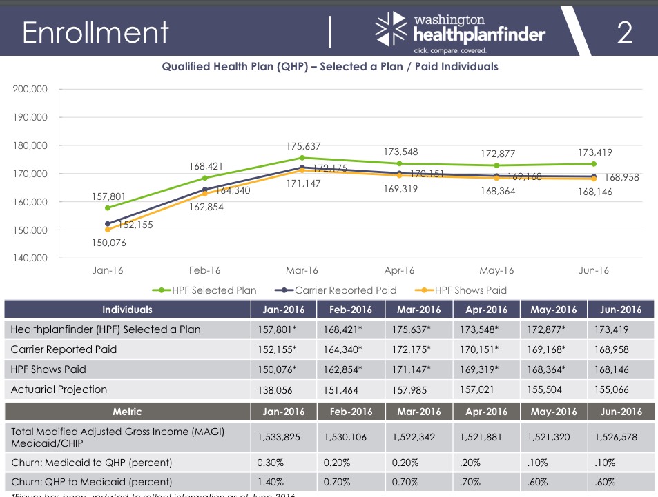 Now that the official ASPE Q1 2016 Effectuated Enrollment report is out, I can compare various state exchange reports against that to see how they're doing. In Washington State, 158,245 people were reported as being enrolled in active, effectuated exchange policies as of 3/31/16.