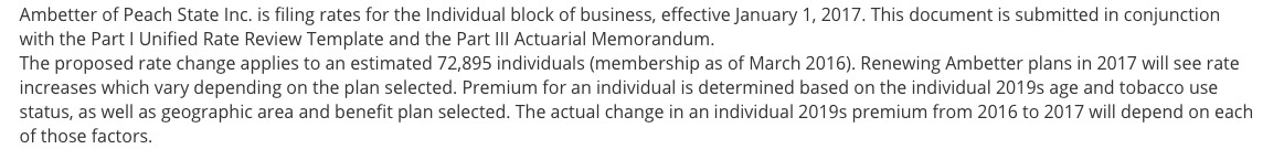 Today I was able to track down the missing Ambetter/Peach State data--both the average requested rate hike (around 8.0%) as well as the number of current enrollees impacted...around 73,000: