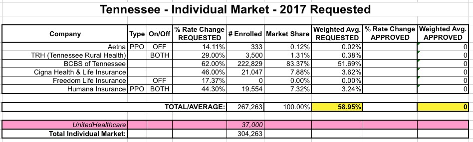 As noted a couple of weeks ago, all three of the major insurance carriers participating in Tennessee's individual market ACA exchange asked for massive rate hikes this year, ranging from 44-62%. Blue Cross Blue Shield asked for 62% in the first place; Cigna and Humana resubmitted their original requests for higher ones.