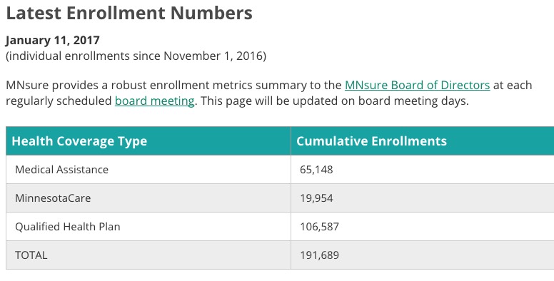 A few days ago I noted that MNsure, Minnesota's ACA exchange, has skyrocketed from last place to first in terms of achieving my personal OE4 enrollment targets, having enrolled 103,578 people in Qualified Health Plans (QHPs), plus another 19,960 in MinnesotaCare (MN's BHP program) and 65,164 in Medicaid.
