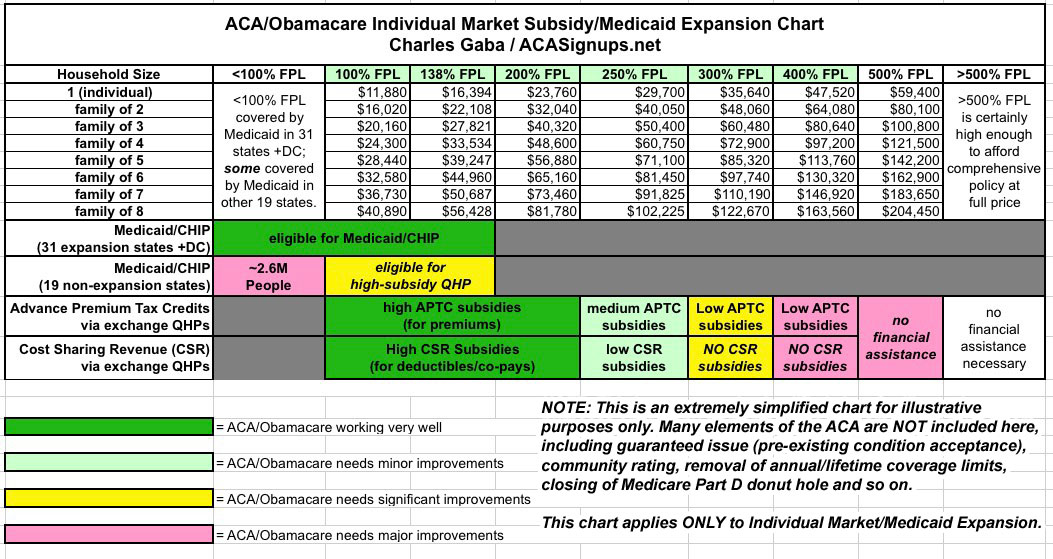OK, it's really important to note that a) this is a very simplified rendering of the true situation and b) this only applies to two populations: The individual market (around 20 million people) and the medicaid expansion population (around 14 million, plus another 2.6 million being denied thanks to 19 states refusing to expand it). In other words, it has nothing to do with the large group market, small group market, Medicare, the VA/TriCare, federal/state/local public employees and so on. This chart only applies to around 37 million people in the U.S. Got it?