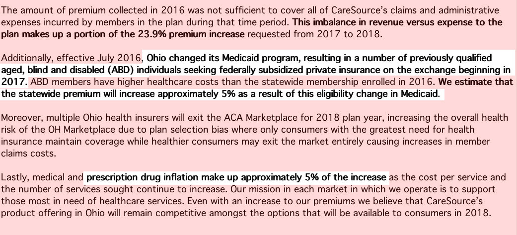 One interesting tidbit: Check out the CareSource filing letter (first one below the table). They don't mention CSRs or mandate enforcement...but they do specify that a full 5 points of their 23.9% increase request is tied to prescription drug inflation (see Shkreli, Martin)...and even more noteworthy, they say that another 5 points is due specifically to "a number of previously [Medicaid-] qualified individuals" being kicked over to the private exchange,