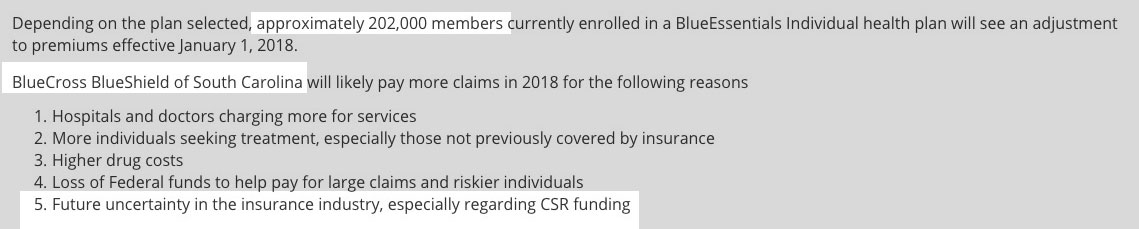 I admit to being a bit confused about the distinction between BCBSSC and BlueChoice HealthPlan, which is also a BCBS carrier...I'm guessing one is for HMOs, the other for PPOs or something. In any event, BlueChoice plans appear to only be available off-exchange, and are thus not subject to the CSR issue. BCBSSC is, however, and the Kaiser Family Foundation estimates that their Silver plans would have to go up 23% if CSR payments are cut off. 87%% of SC exchange enrollees are on Silver plans, so that should be roughly 20.2% across all policies.