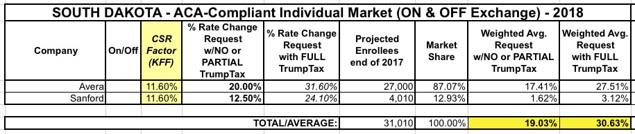 North Dakota's numbers are pretty straightforward. Only three carriers, none of whch say anything about CSR or mandate concerns, so I have to assume that their requested rate increases are the best-case scenario. In addition, the KFF estimates suggest only a 5 point additional CSR factor anyway. This results in roughly a 23% average hike if CSRs are paid vs. a 28% increase if they aren't.