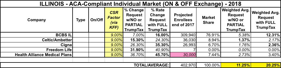 For instance in Illinois, Kaiser estimates that carriers would have to raise rates by 14% on Silver plans to cover their CSR losses. However, only 64% of Illinois exchange enrollees have silver plans to begin with, so I'm only plugging in about 9%. There are 5 carriers operating on the Illinois individual market (well, really 4, since "Freedom Life" doesn't count). I have the hard enrollment numbers for 4 of the 5; for Health Alliance Medical Plans I used 30,000 based on their 2016 number. Overall, Illinois is looking at around 11.3% w/partial sabotage, 20.3% with full sabotage: