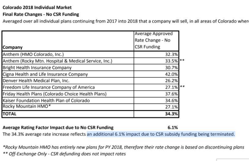 As for CSR payments not being made, however, the press release accompanying the rate tables was more vague; it stated that they would be "up to" 14 points higher, but didn't clarify whether that would apply to every individual plan or only the Silver policies, which is how most other states appear to be handling it. I assumed the "no-CSR" average would be roughly 32.9% if the load is only dumped on Silver plans, but 40.7% if spread across all metal levels.