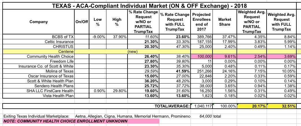 Back in early August, I pieced together a rough average of the requested rate increases for the Lone Star State of around 20% if CSR payments are made or 32.5% if they aren't: