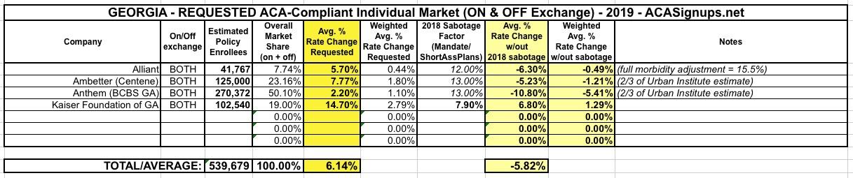 Whew! Georgia only has 4 carriers participating in the individual market, but tracking down some of the data was a royal pain in the butt, especially Ambetter/Centene, which not only buried the numbers I needed inside a whopping 1,900-page PDF file, but the actual average requested rate increase wasn't even included; for that I had to check a different file. Yeesh.