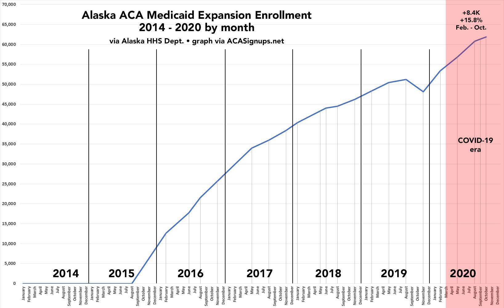 Over at Xpostfactoid, my colleague Andrew Sprung has been doing a great job of tracking ACA Medicaid expansion enrollment growth since the onset of the COVID-19 pandemic this past February/March at the macro (national) level, by looking at around a dozen states which have monthly reports available. He puts the overall enrollment growth rate at 23.6% from February thorugh October 2020.