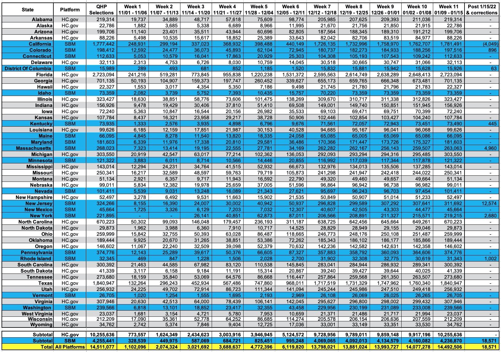 First up is the top line numbers: Just how many people selected Qualified Health Plans (QHPs) during the 2022 OEP, which ran from November 1st, 2021 through different ending dates depending on the state. In the 33 states hosted via the federal ACA exchange (HealthCare.Gov), as well as 9 of the 18 state-based marketplaces (SBMs), the ending date was January 15th, 2022.
