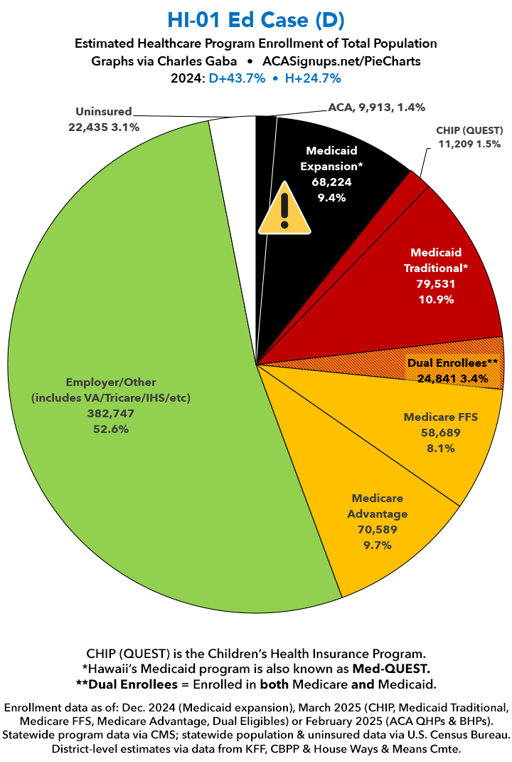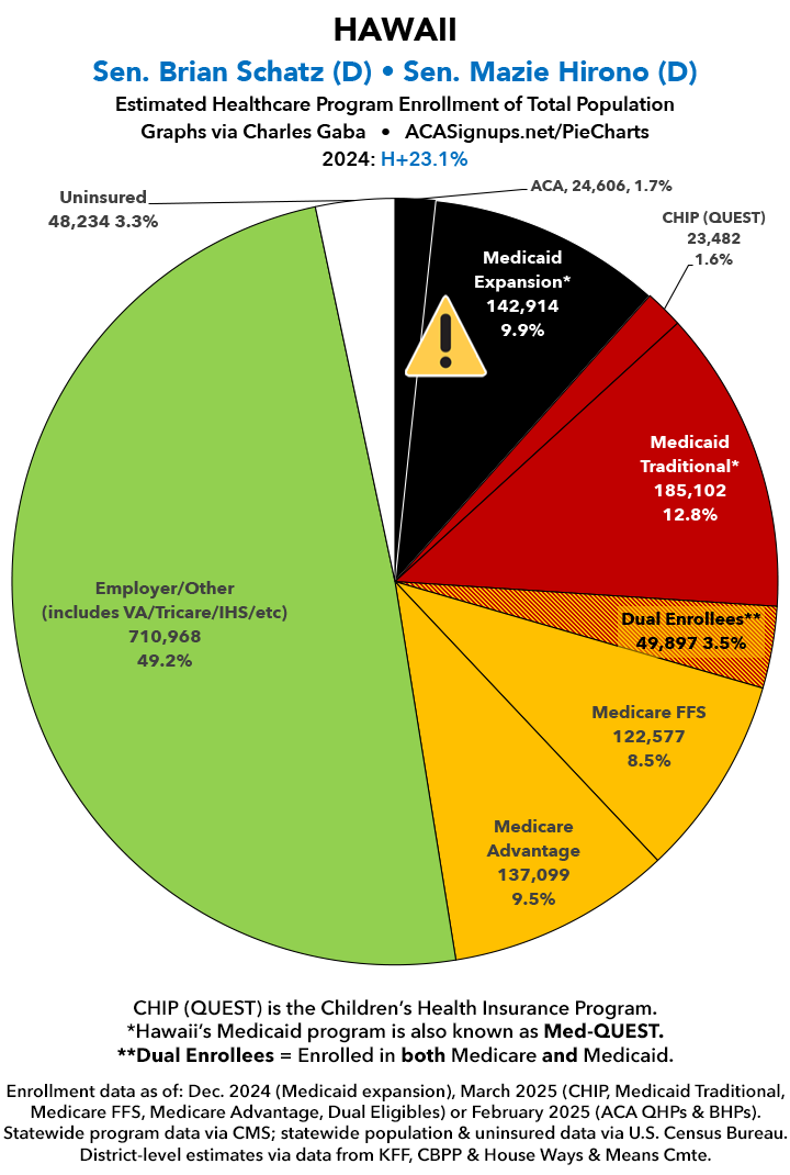 UPDATE 7/16/25: I've updated the web versions of the graphics with the most up-to-date enrollment data I have access to. The black sections w/the ⚠️ symbol are those most at risk of losing healthcare coverage due to H.R. 1, the "One Big Beautiful Bill Act" (aka the #MAGAMurderBill).