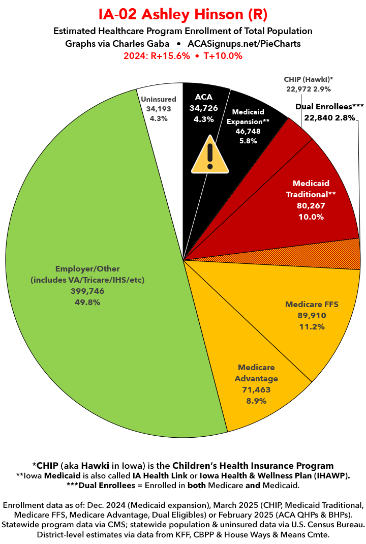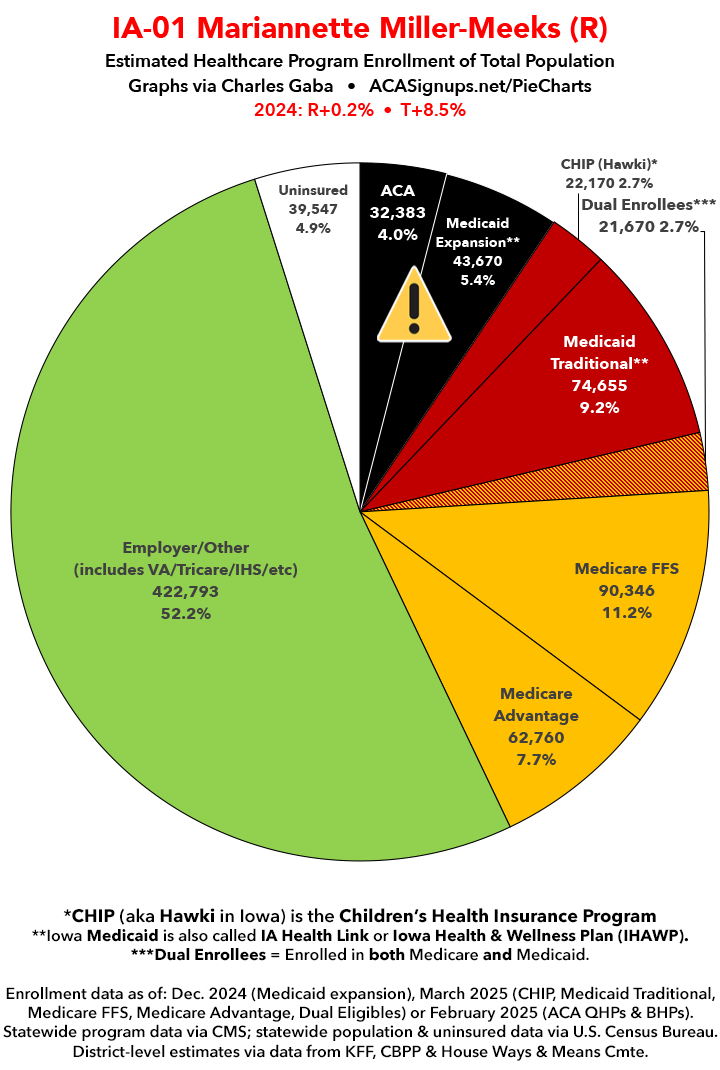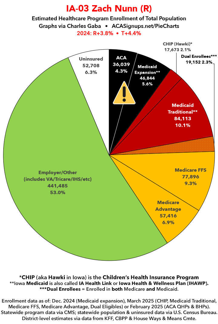 UPDATE 7/4/25: I've updated the web versions of the graphics with the most up-to-date enrollment data I have access to. The black sections w/the ⚠️ symbol are those most at risk of losing healthcare coverage due to H.R. 1, the "One Big Beautiful Bill Act" (aka the #MAGAMurderBill).