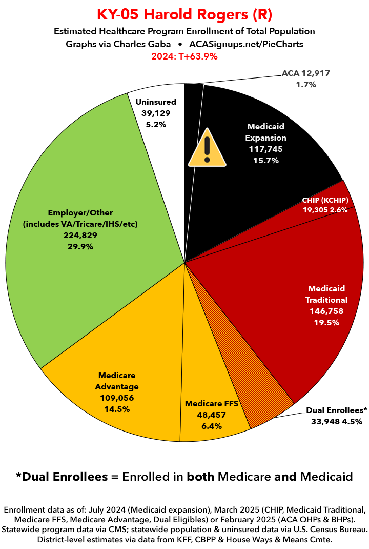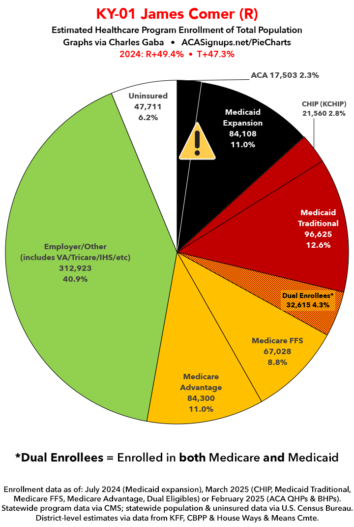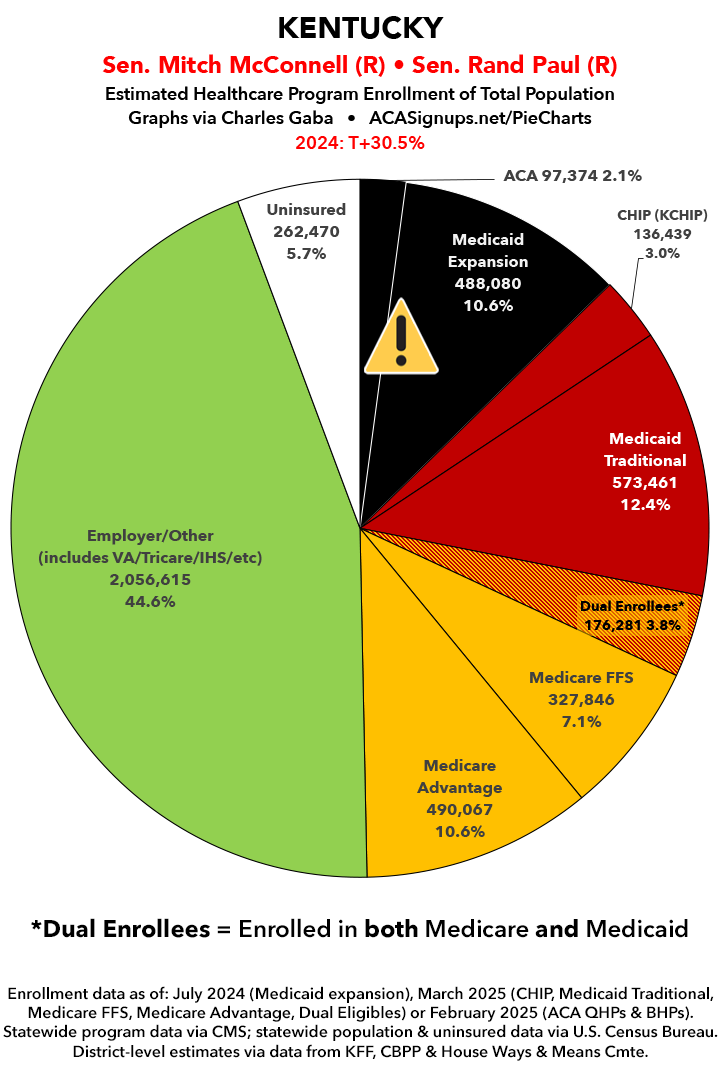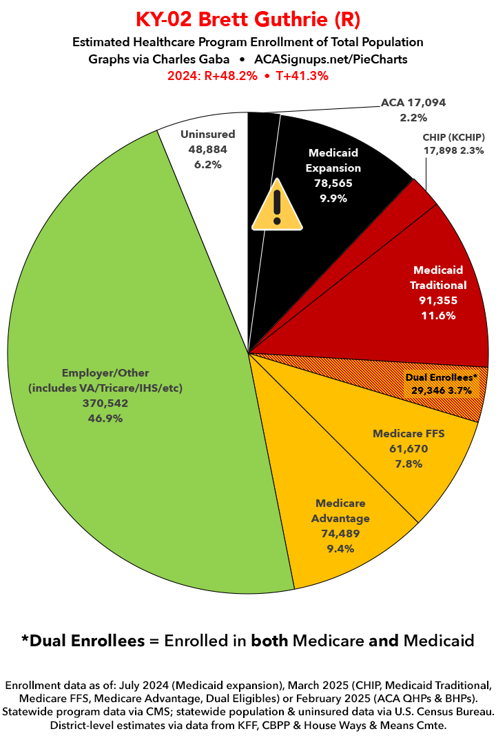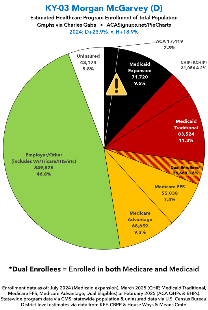 UPDATE 7/5/25: I've updated the web versions of the graphics with the most up-to-date enrollment data I have access to. The black sections w/the ⚠️ symbol are those most at risk of losing healthcare coverage due to H.R. 1, the "One Big Beautiful Bill Act" (aka the #MAGAMurderBill).