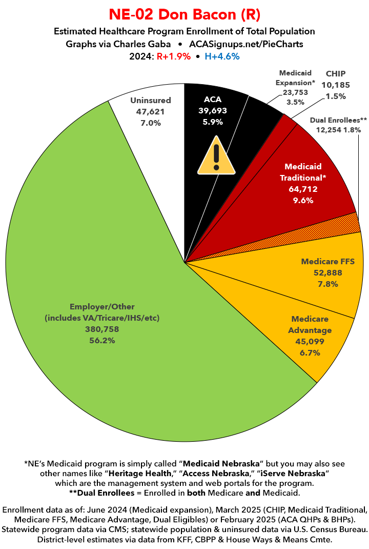 UPDATE 7/6/25: I've updated the web versions of the graphics with the most up-to-date enrollment data I have access to. The black sections w/the ⚠️ symbol are those most at risk of losing healthcare coverage due to H.R. 1, the "One Big Beautiful Bill Act" (aka the #MAGAMurderBill).