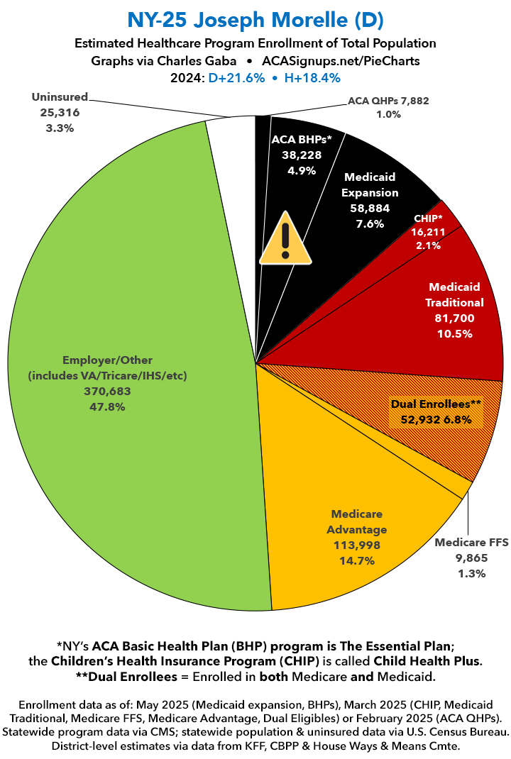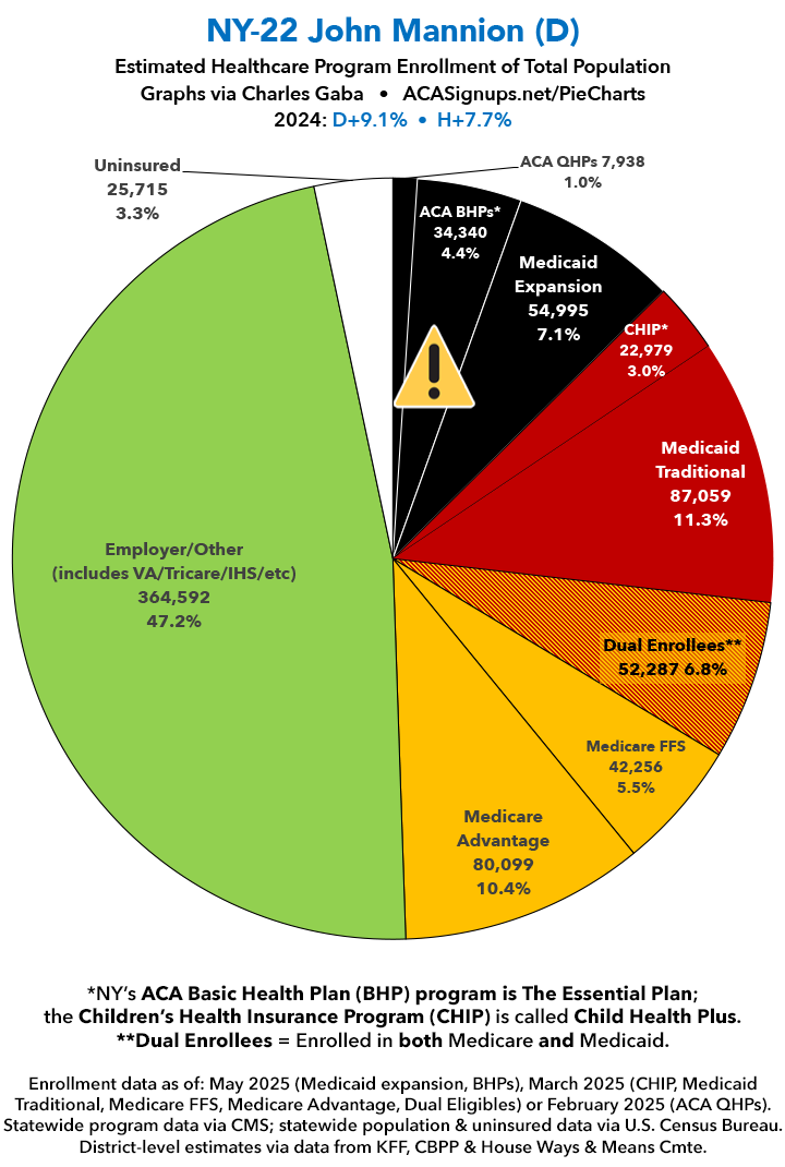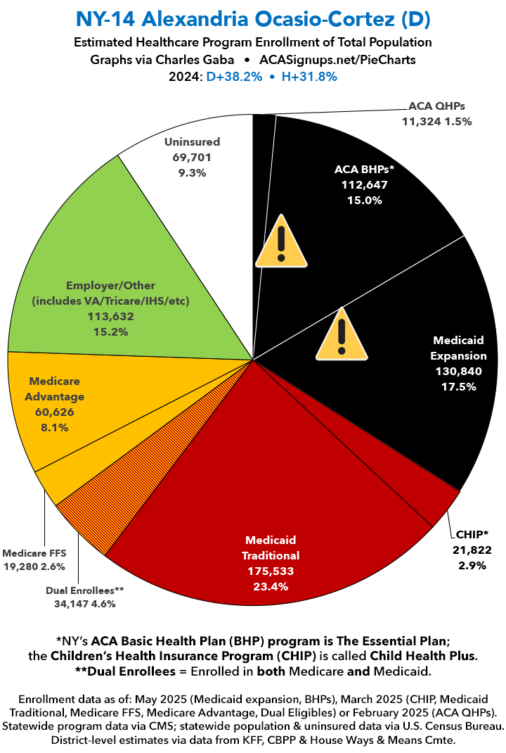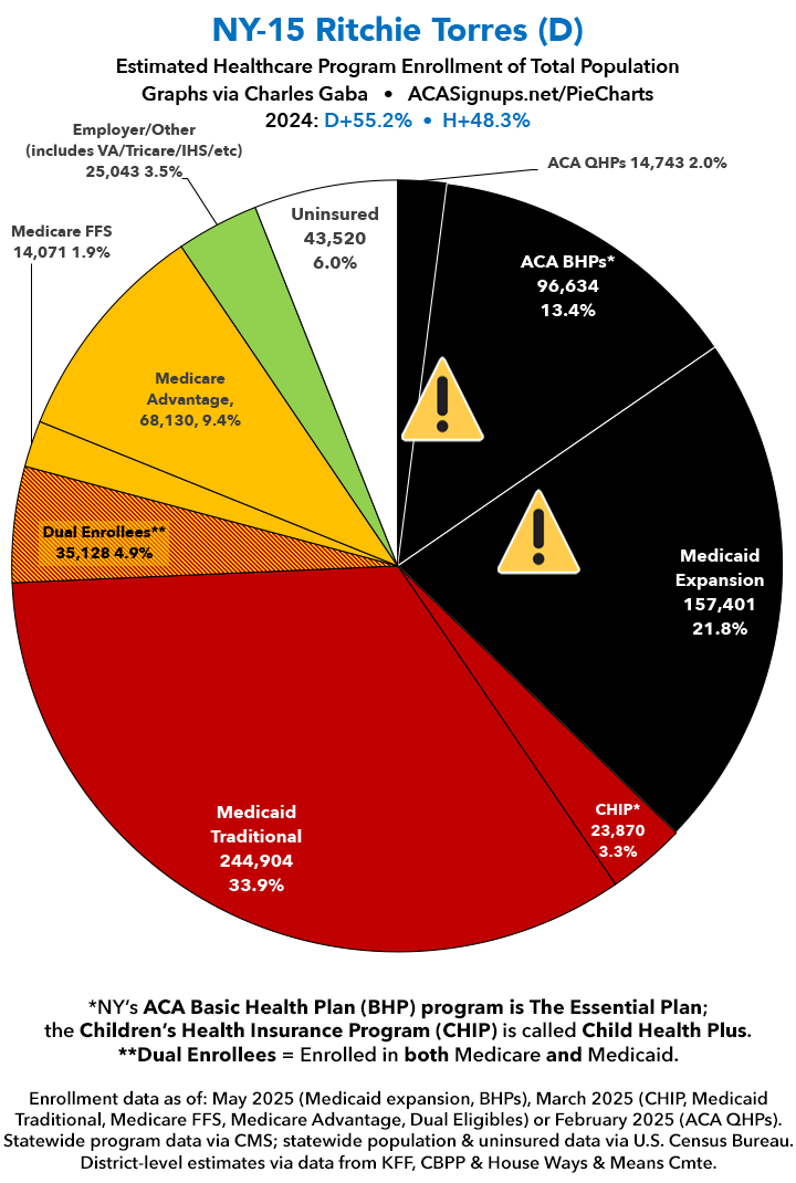 UPDATE 7/9/25: I've updated the web versions of the graphics with the most up-to-date enrollment data I have access to. The black sections w/the ⚠️ symbol are those most at risk of losing healthcare coverage due to H.R. 1, the "One Big Beautiful Bill Act" (aka the #MAGAMurderBill).