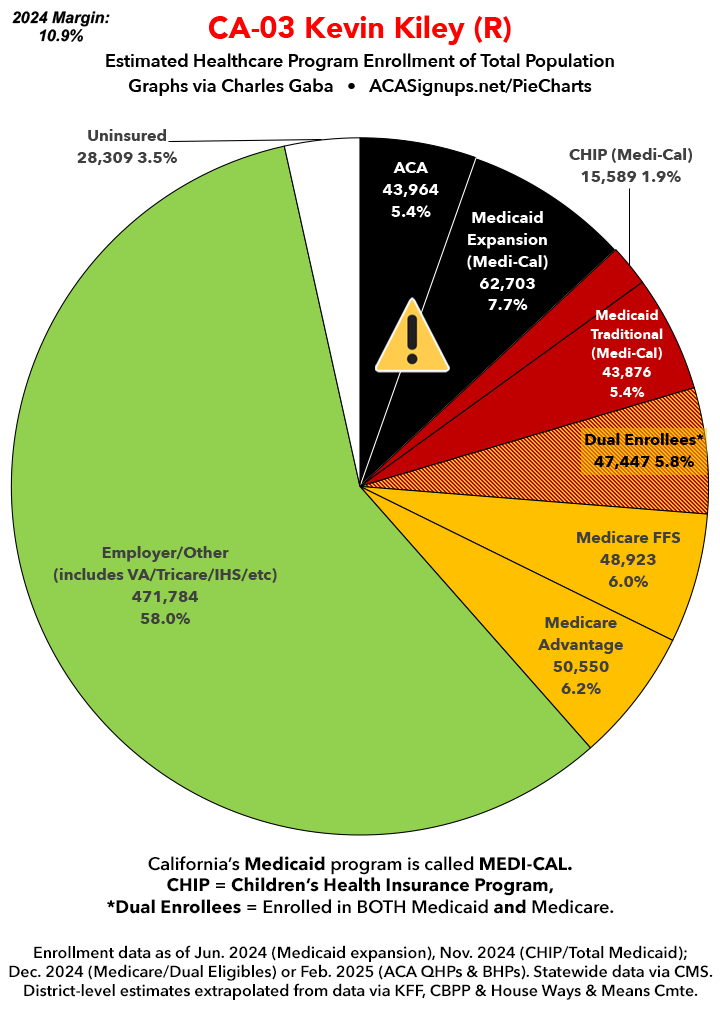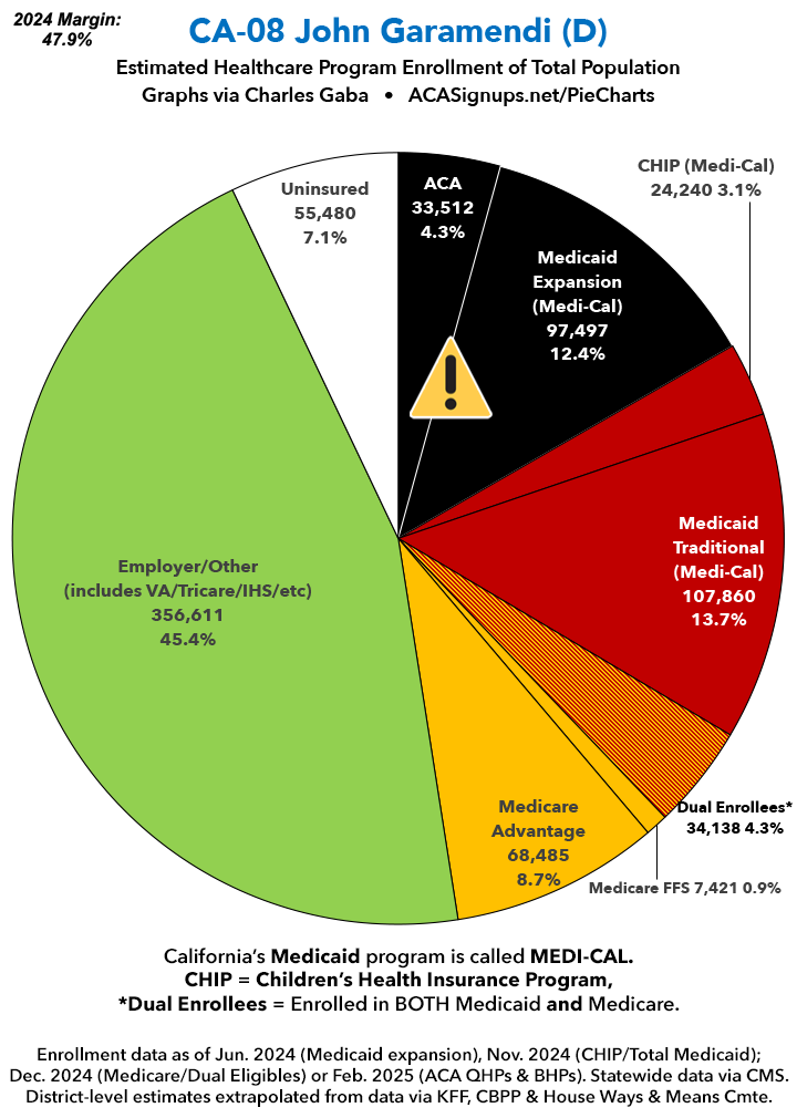 With the pending dire threat to several of these programs (primarily Medicaid & the ACA) from the House Republican Budget Proposal which recently passed, I'm going a step further and am generating pie charts which visualize just how much of every Congressional District's total population is at risk of losing healthcare coverage.