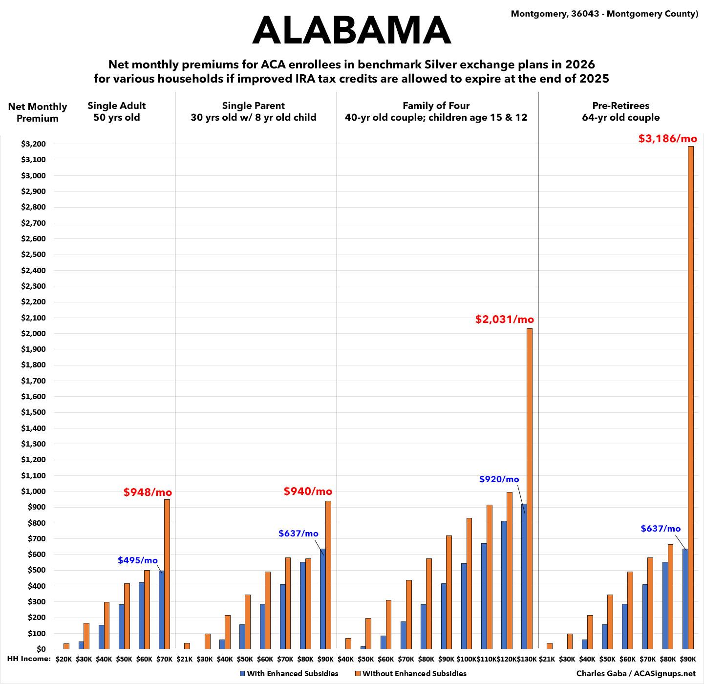 • NEW: The original version of this analysis included a 4.3% increase in the unsubsidized benchmark plan premium based on a projection by the Congressional Budget Office. However, that was a national average projection which didn’t take into account other factors like increased utilization, medical inflation and so on. This updated version assumes the actual 2026 Alabama rate filings which average 21.7% statewide.