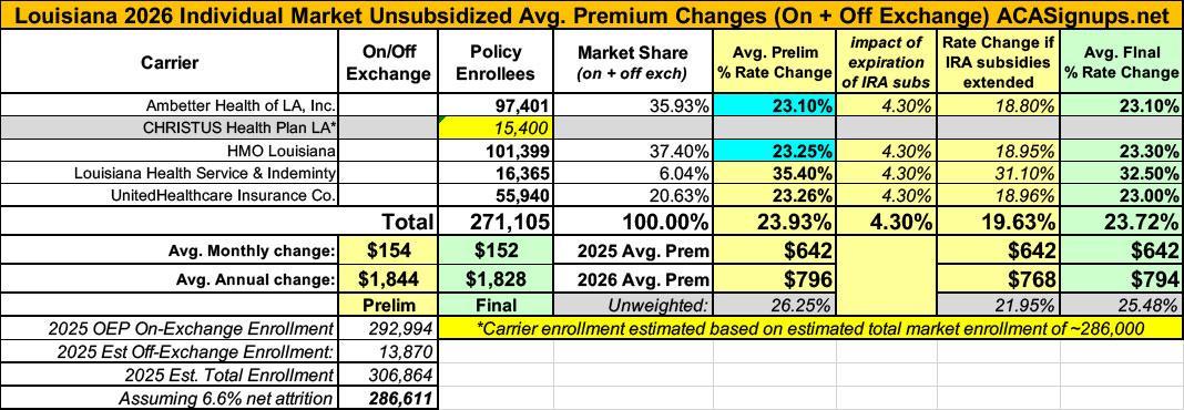 Louisiana has around ~293,000 residents enrolled in ACA exchange plans, 96% of whom are currently subsidized. I estimate they also have another ~13,000 unsubsidized off-exchange enrollees.