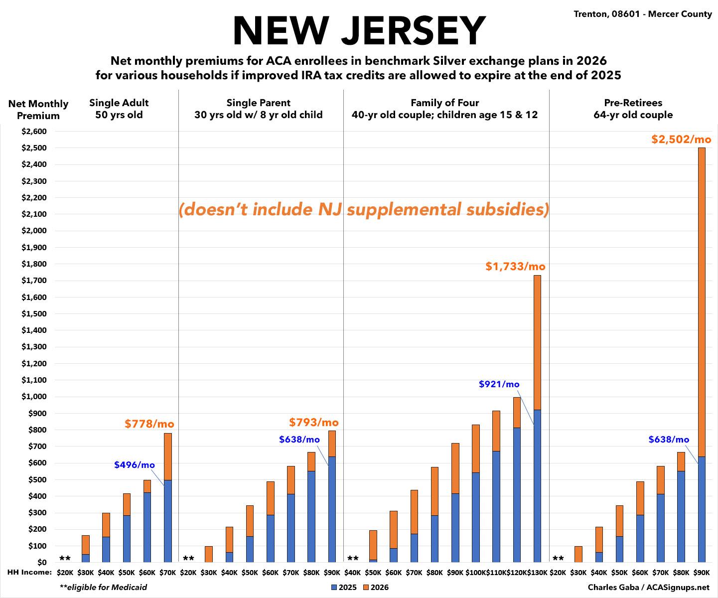 New Jersey has around ~513,000 residents enrolled in ACA exchange plans, 85% of whom are currently subsidized. I estimate they also have another ~76,000 unsubsidized off-exchange enrollees.