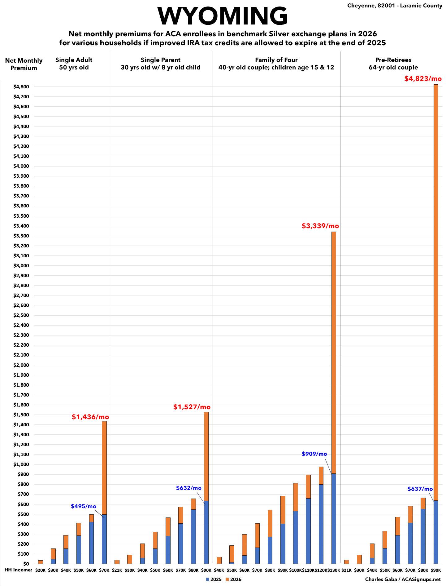 NEW: The original version of this analysis included a 4.3% increase in the unsubsidized benchmark plan premium based on a projection by the Congressional Budget Office. However, that was a national average projection which didn’t take into account other factors like increased utilization, medical inflation and so on. This updated version assumes the actual 2026 Wyoming rate filings.