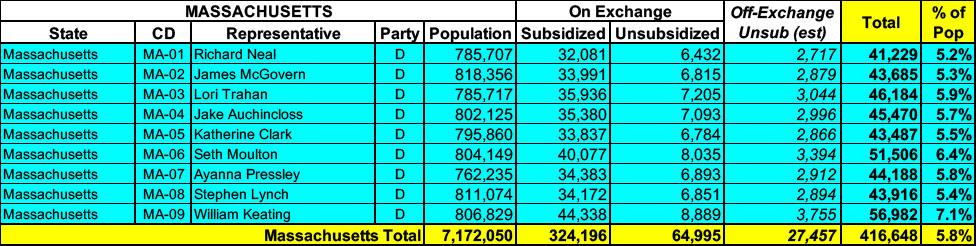 Massachusetts has around 390,000 residents enrolled in ACA exchange plans, 83% of whom are currently subsidized. I estimate they also have another ~27,000 unsubsidized off-exchange enrollees.