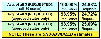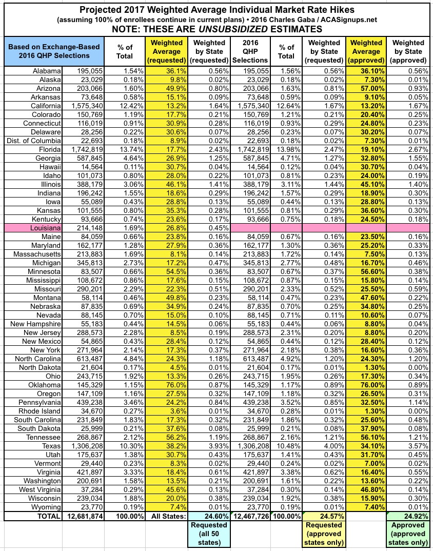 When you average all three methods together, the weighted UNSUBSIDIZED approved rate hike average for EVERY state except for Louisiana comes in at 25.1%: