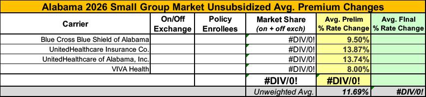 UPDATE 10/18/25: Alabama's individual market carriers have published their approved 2026 gross rate filings. The only major change was Celtic, which had their increase reduced from 29% to 25%. Overall the weighted average increase was shaved down slightly to 21.1%.